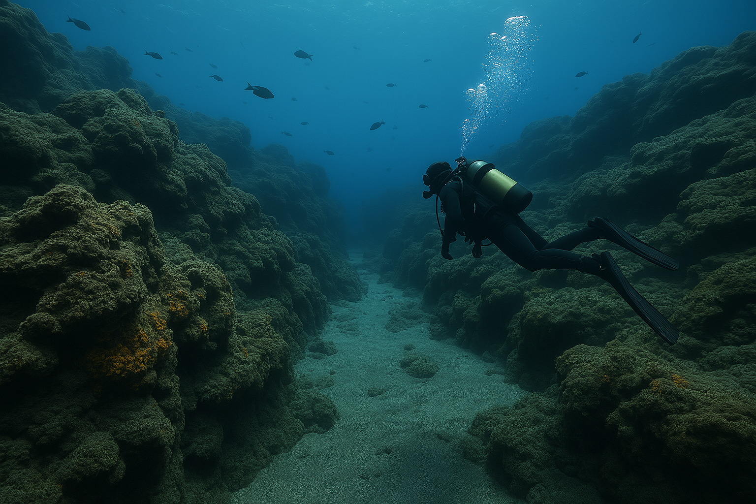 Diese karge, fast mondartige Unterwasserlandschaft hat ihren ganz eigenen Reiz – rau, ursprünglich und geheimnisvoll. Gelbschwämme, Anemonen und gelegentliche Farbtupfer durch Fischschwärme sorgen für lebendige Kontraste. Die Sichtweite unter Wasser beträgt oft über 30 Meter – perfekte Bedingungen also für ausgedehnte Erkundungstouren.